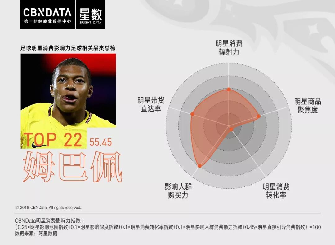 本次發布的2018年“CBNData明星消費影響力榜-世界杯特輯”全部內容 ,均以CBNData明星消費影響力指數為衡量標準 ,從明星消費輻射力、明星商品聚集度、明星消費轉化率 、影響人群購買力和明星帶貨直達力五大維度 ,對明星消費價值進行綜合評估 。榜單產品將涵蓋年度總榜、季度總榜 、月度榜;品類榜、地域榜及人群榜等不同節點,多重維度 。
